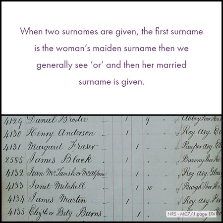 When two surnames are given, the first surname is the woman’s maiden surname then we generally see ‘or’ and then her married surname is given. This can be confusing as the word ‘née’, from French meaning born, is used after a woman’s married name to introduce a woman’s maiden surname. Although née is now used in Scotland, this is not an old custom so if you are tracing your Scottish family tree you are unlikely to see this in Scottish records before 1900.